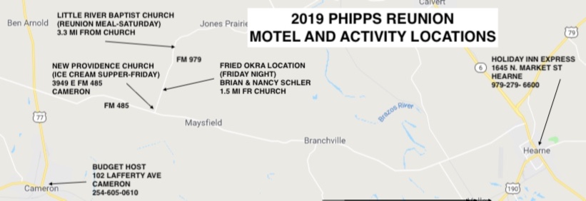 The Reunion will officially kick-off at 6 PM (yes, come early) on Friday July 19 and last late into the evening. On Friday, the activities will begin at the New Providence Baptist Church located at the intersection of FM 979 and FM 485 toward Maysfield. For those of you using a GPS, the physical address is 3949 E. FM 485, Cameron, TX. We hope everyone will come early for fellowship “under the trees” before we dig into the ice cream at 7 PM.