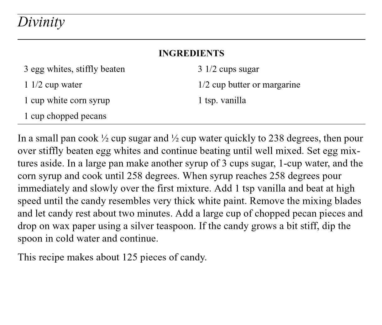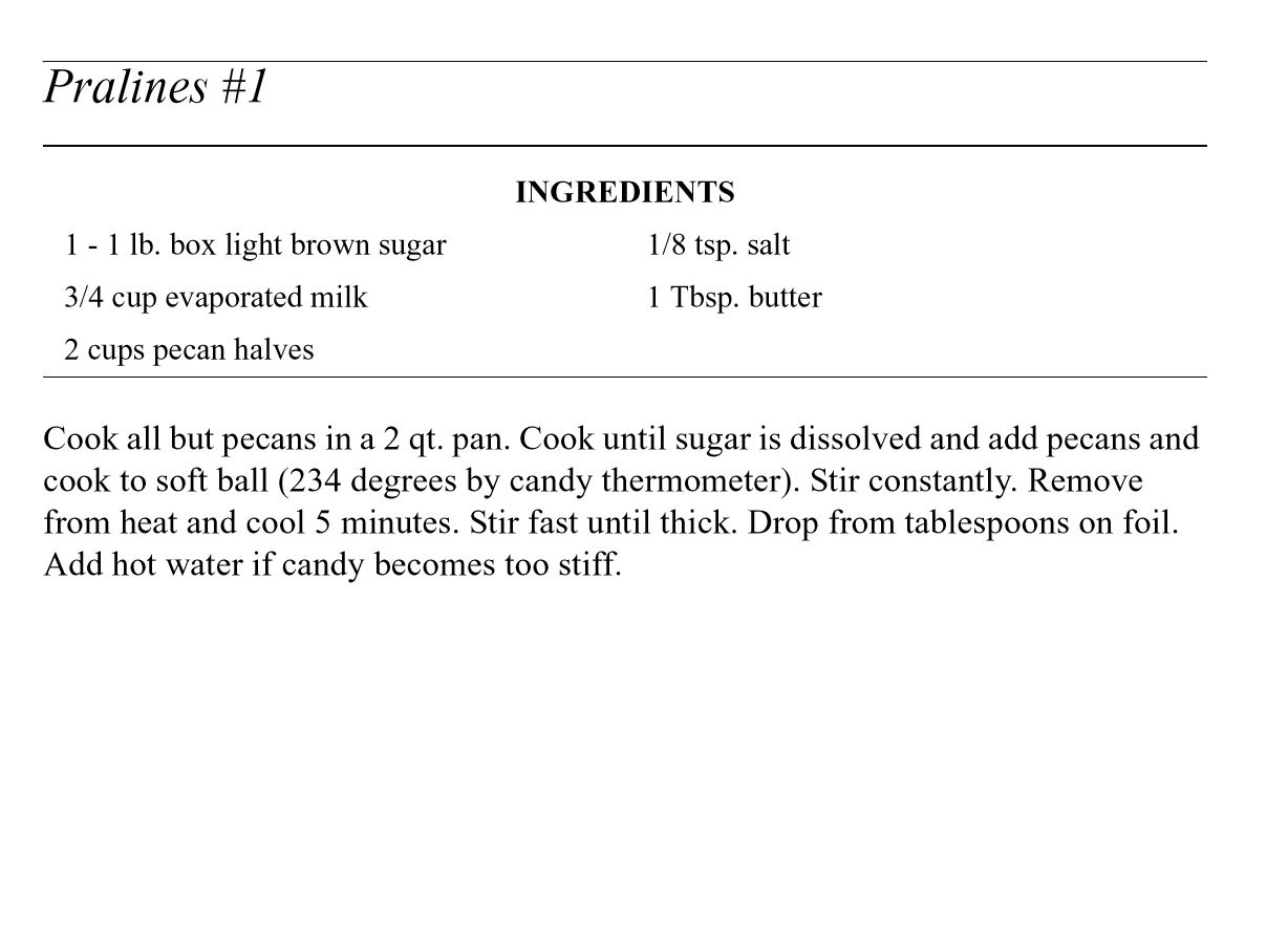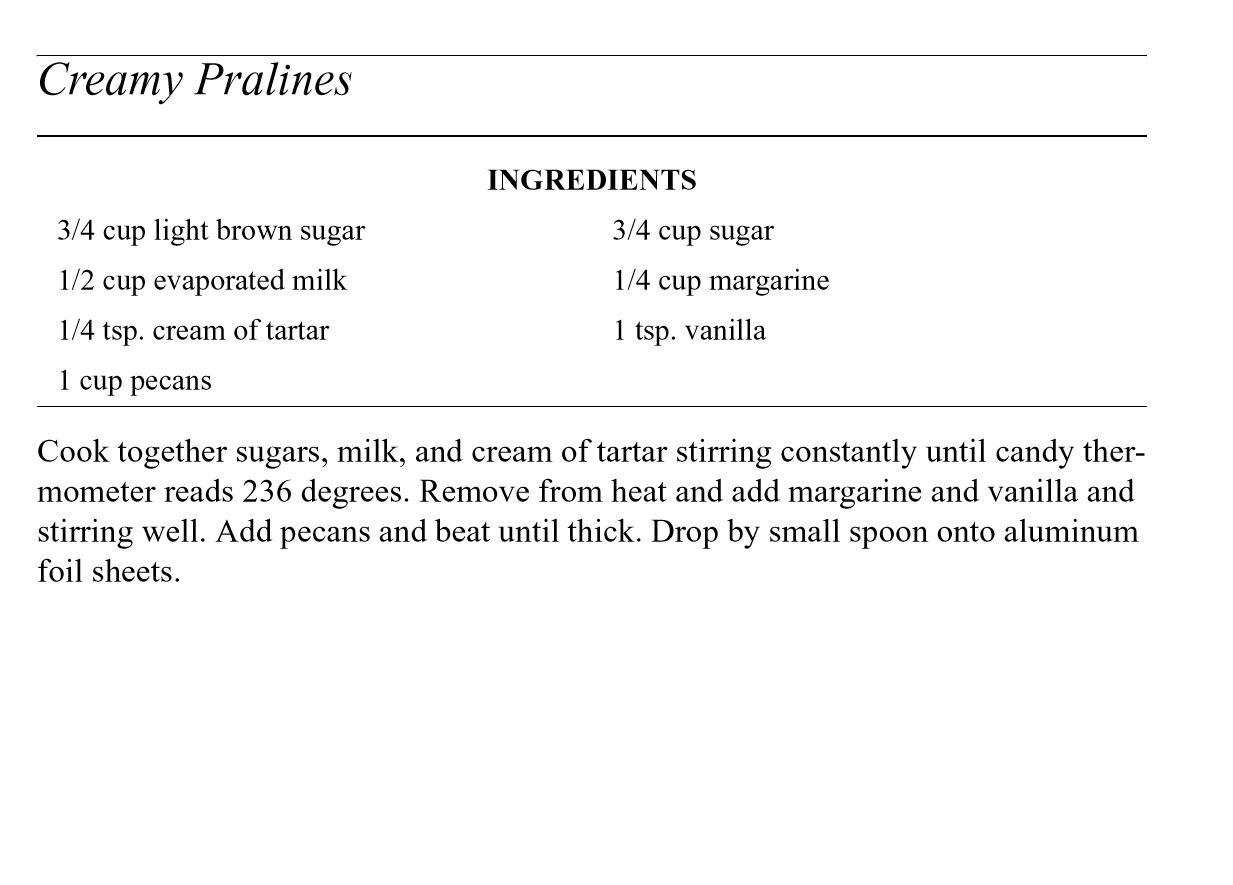 Candies Click below to open recipes Creamy PralinesDivinityFudgeGooey Turtle BarsMarshmallow FudgeOld Fashion FudgeOld Fashion Peanut BrittlePeanut ClustersPecan BarsPineapple Bars SupremePralines # 1Pralines # 2 Back to Barbara’s Cookbook Share this: Share on X (Opens in new window) X Share on Facebook (Opens in new window) Facebook Like Loading...