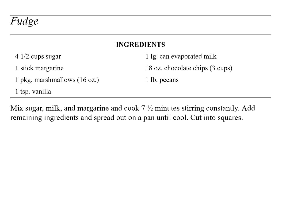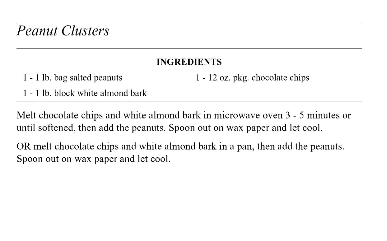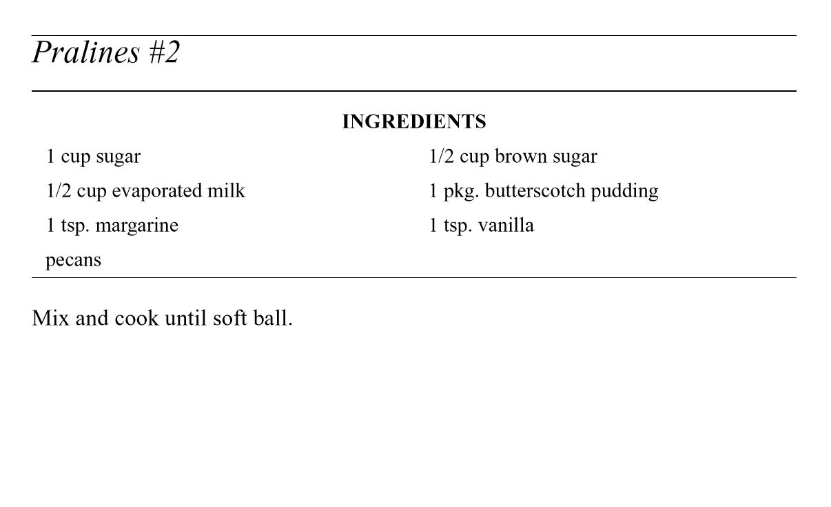 Candies Click below to open recipes Creamy PralinesDivinityFudgeGooey Turtle BarsMarshmallow FudgeOld Fashion FudgeOld Fashion Peanut BrittlePeanut ClustersPecan BarsPineapple Bars SupremePralines # 1Pralines # 2 Back to Barbara’s Cookbook Share this: Share on X (Opens in new window) X Share on Facebook (Opens in new window) Facebook Like Loading...