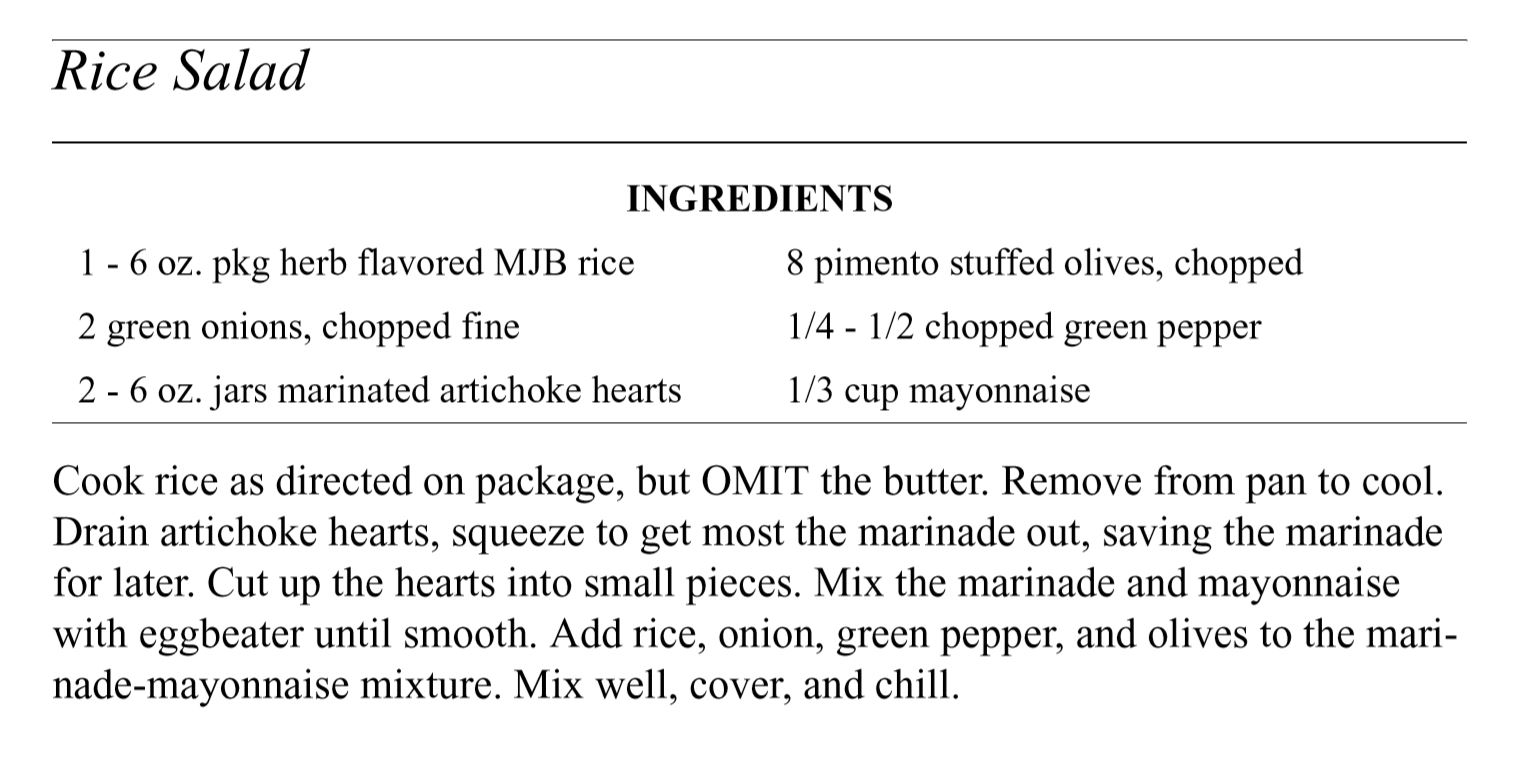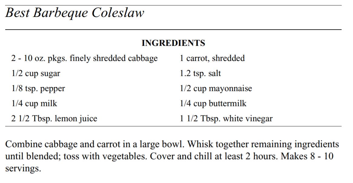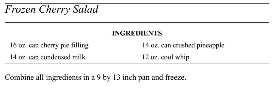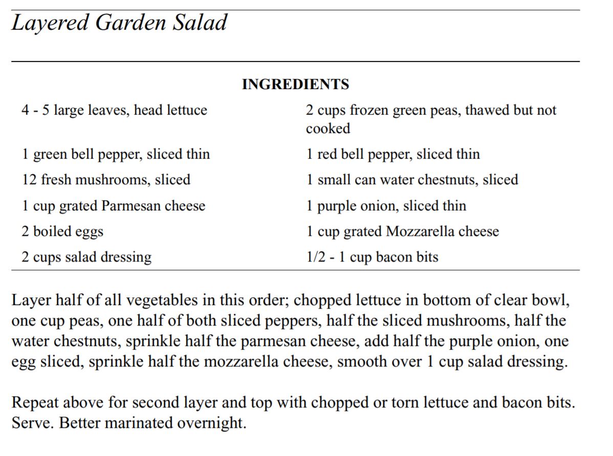 Salads and Soups Click below to open recipes Best Barbeque ColeslawFrozen Cherry SaladLayered Garden SaladPasta Salad with BroccoliRefried Bean SoupRice SaladSour Cream Potato SaladTaco Soup Back to Barbara’s Cookbook Share this: Share on X (Opens in new window) X Share on Facebook (Opens in new window) Facebook Like Loading...
