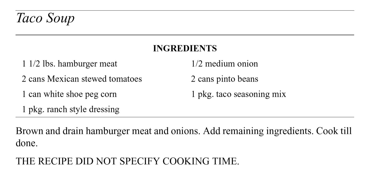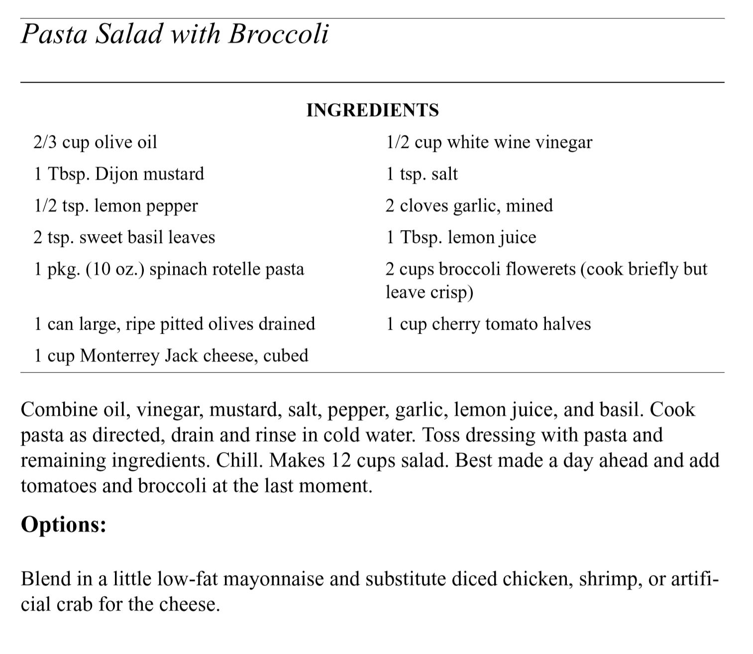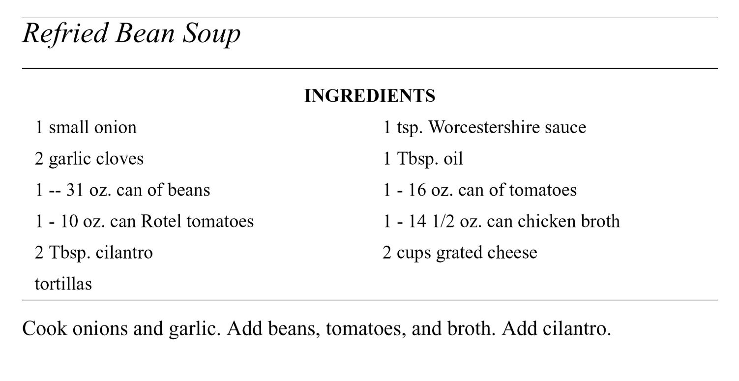 Salads and Soups Click below to open recipes Best Barbeque ColeslawFrozen Cherry SaladLayered Garden SaladPasta Salad with BroccoliRefried Bean SoupRice SaladSour Cream Potato SaladTaco Soup Back to Barbara’s Cookbook Share this: Share on X (Opens in new window) X Share on Facebook (Opens in new window) Facebook Like Loading...