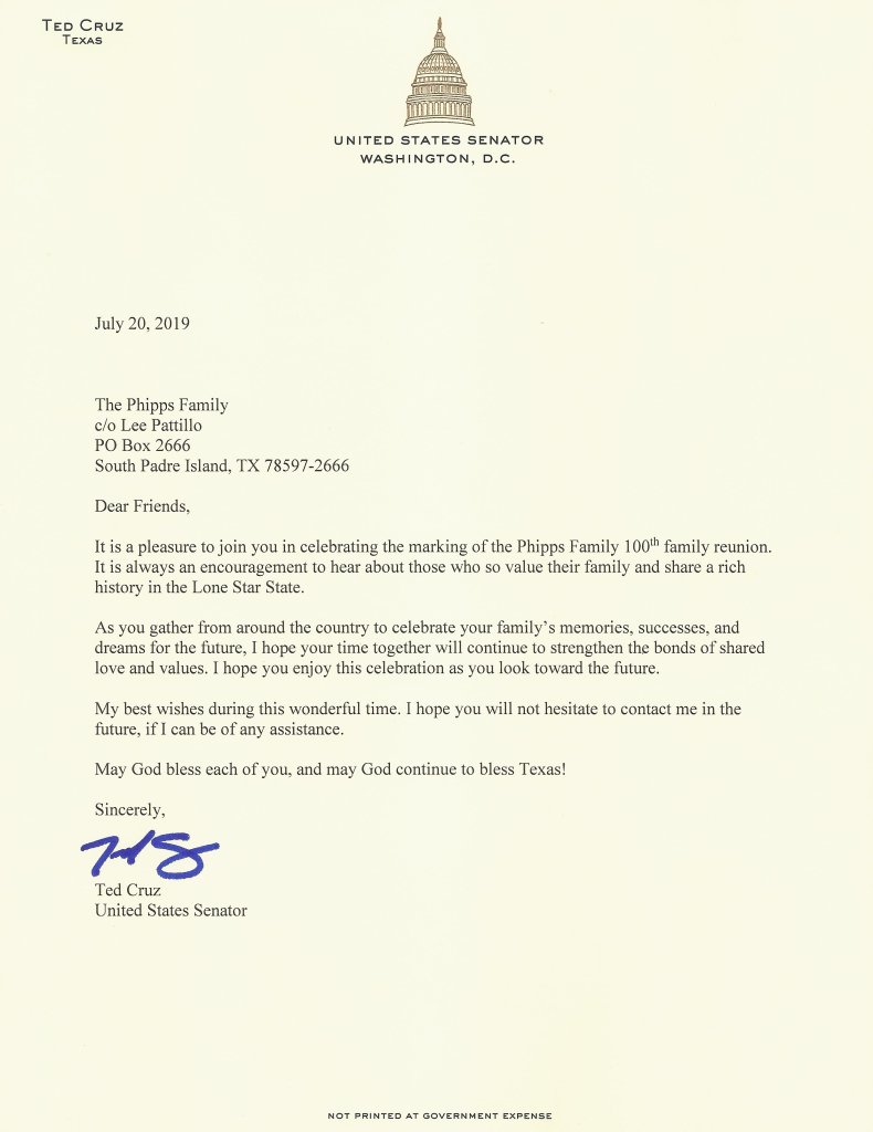 We have received this acknowledgement from United States Senator Ted Cruz.